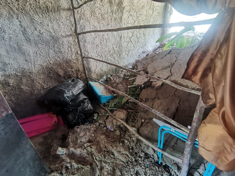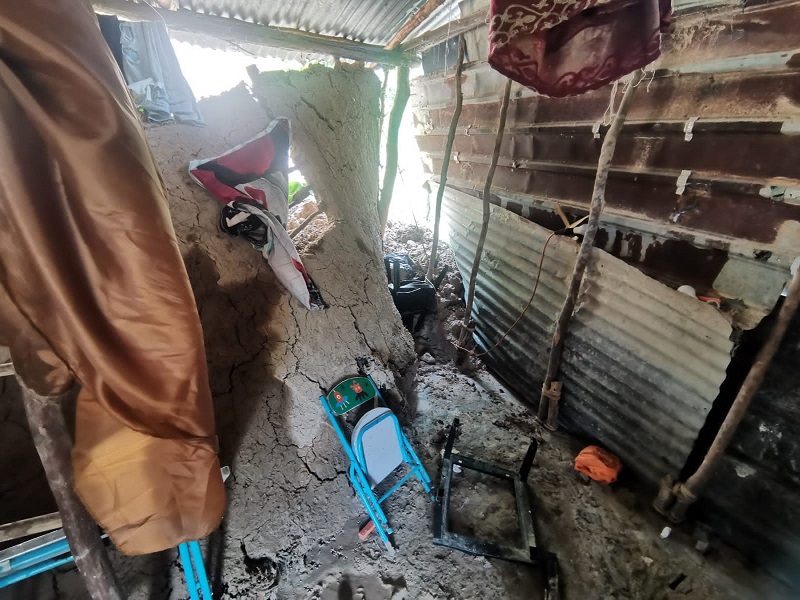 Esta familia tenía más de un año de vivir en esta residencia. Según el informe técnico, las fuertes lluvias de los últimos días ocasionaron que la tierra cediera, cayendo sobre la endeble estructura, lo que pone en peligro a la familia, que fue reubicada en casa de un pariente, mientras se le busca alternativas de respuestas.