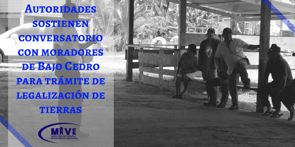 Con el objetivo de verificar el estatus en materia de legalización de tierras, explicar avances y rendir informe general, autoridades de la dirección regional del Ministerio de Vivienda y Ordenamiento Territorial (Miviot) en la provincia de Bocas del Toro se reunieron con dirigentes de Bajo Cedro.