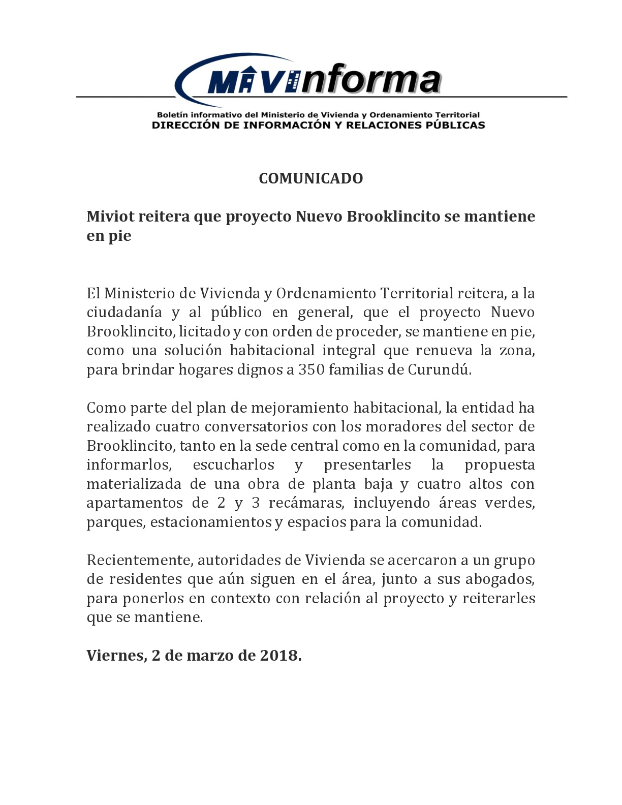 El Ministerio de Vivienda y Ordenamiento Territorial reitera, a la ciudadanía y al público en general, que el proyecto Nuevo Brooklincito, licitado y con orden de proceder, se mantiene en pie, como una solución habitacional integral que renueva la zona, para brindar hogares dignos a 350 familias de Curundú.