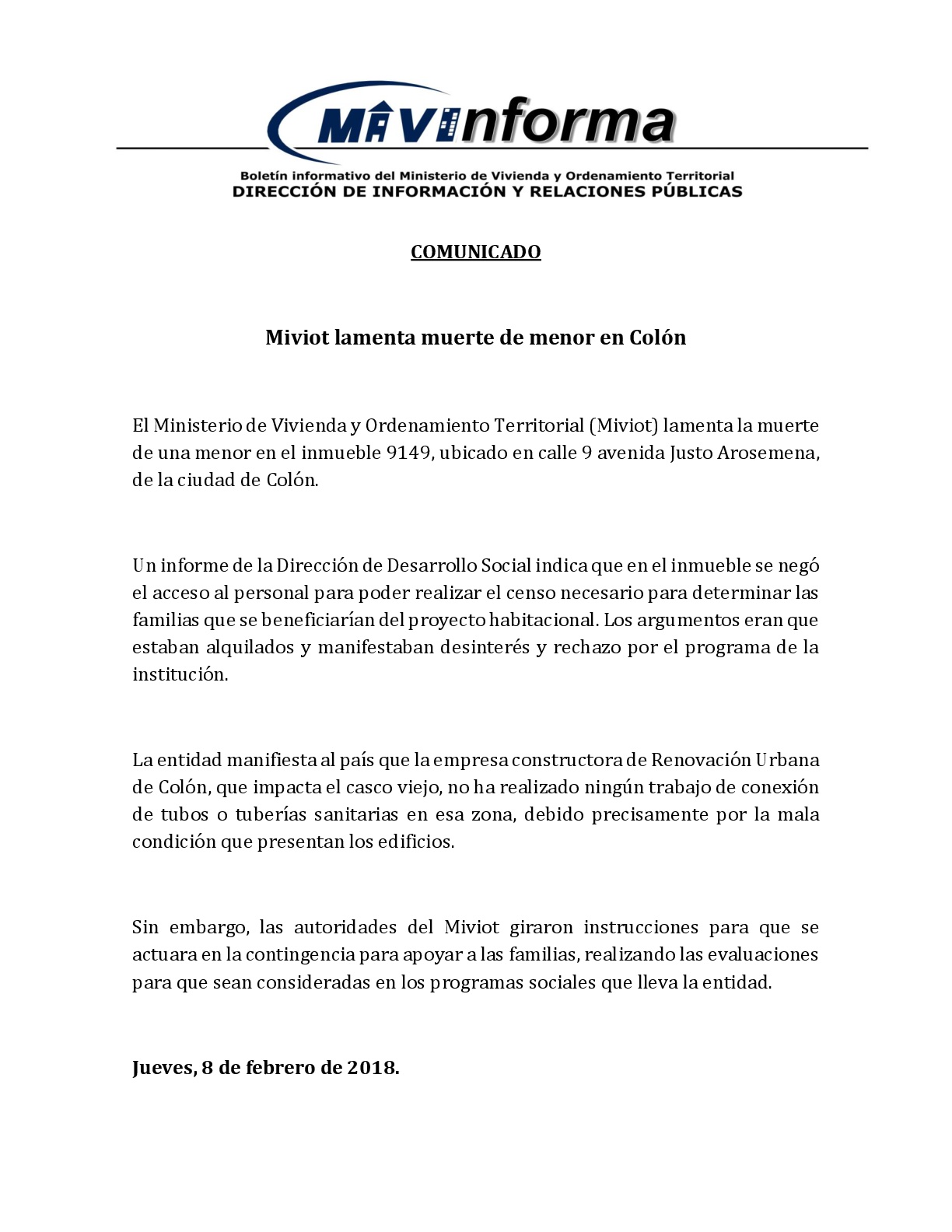 El Ministerio de Vivienda y Ordenamiento Territorial (Miviot) lamenta la muerte de una menor en el inmueble 9149, ubicado en calle 9 avenida Justo Arosemena, de la ciudad de Colón.