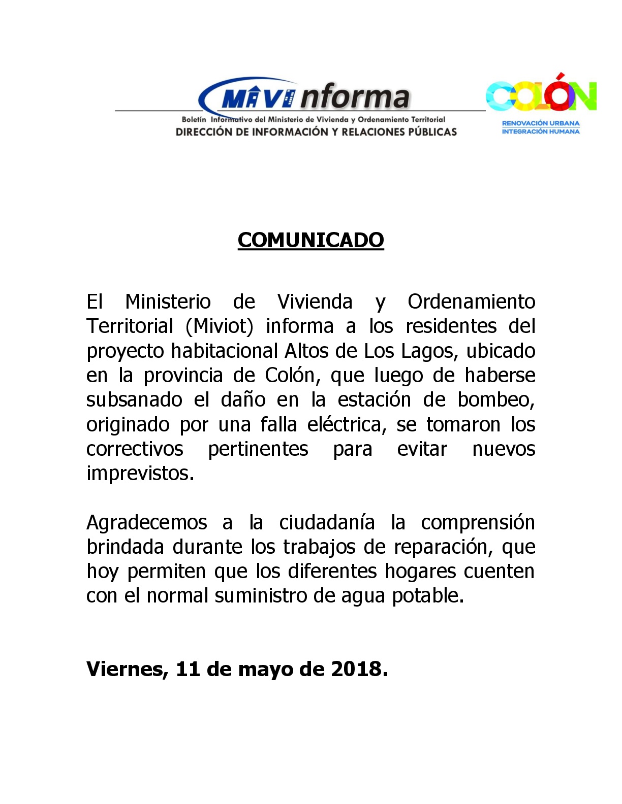 El Ministerio de Vivienda y Ordenamiento Territorial (Miviot) informa a los residentes del proyecto habitacional Altos de Los Lagos, ubicado en la provincia de Colón, que luego de haberse subsanado el daño en la estación de bombeo, originado por una falla eléctrica, se tomaron los correctivos pertinentes para evitar nuevos imprevistos.