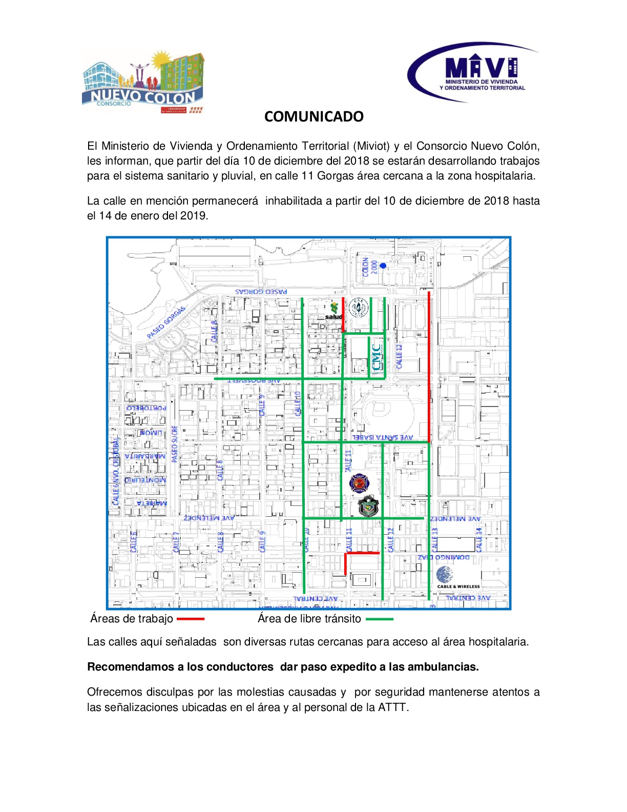 El Ministerio de Vivienda y Ordenamiento Territorial (Miviot) y el Consorcio Nuevo Colón, les informan, que partir del día 10 de diciembre del 2018 se estarán desarrollando trabajos para el sistema sanitario y pluvial, en calle 11 Gorgas área cercana a la zona hospitalaria.