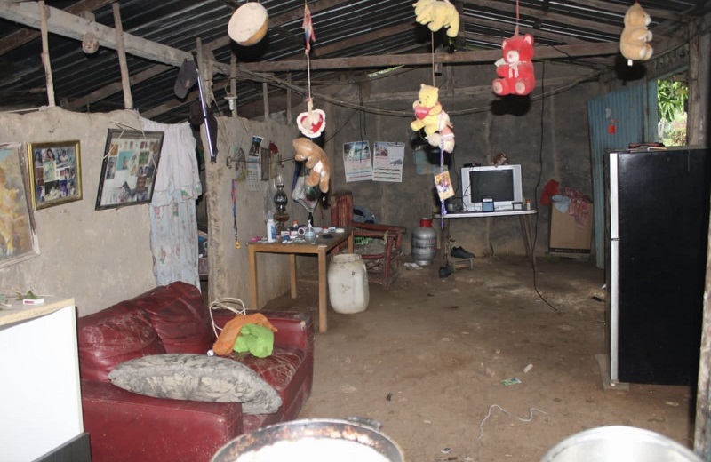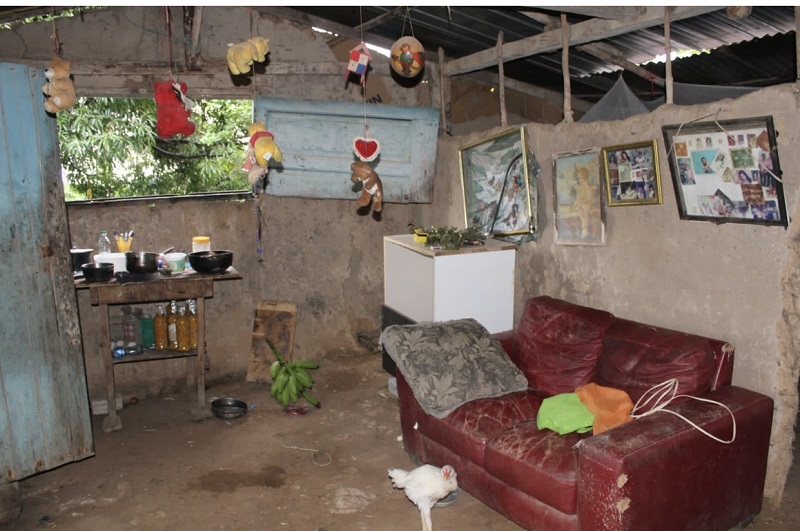 La residencia está construida con material improvisado, paredes de barro que están rajadas y techo de zinc sostenido con horcones, ventanas de maderas, piso de tierra y usa letrina en mal estado. También disponen de los servicios de luz eléctrica y agua de pozo comunal.