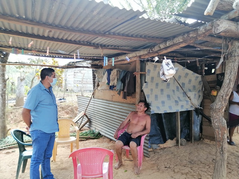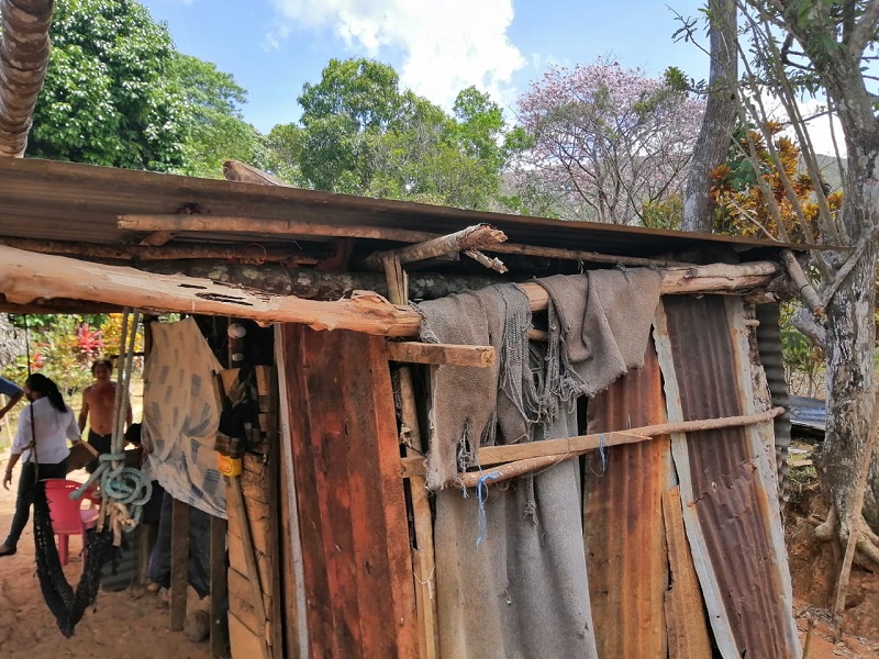 Su casa improvisada está construida con paredes de madera, zinc, plástico y tela, sostenida con troncos de árbol seco, el techo es entre zinc viejo y pencas y tienen piso de tierra, además las personas realizan sus necesidades fisiológicas en el monte por falta de sistema sanitario.