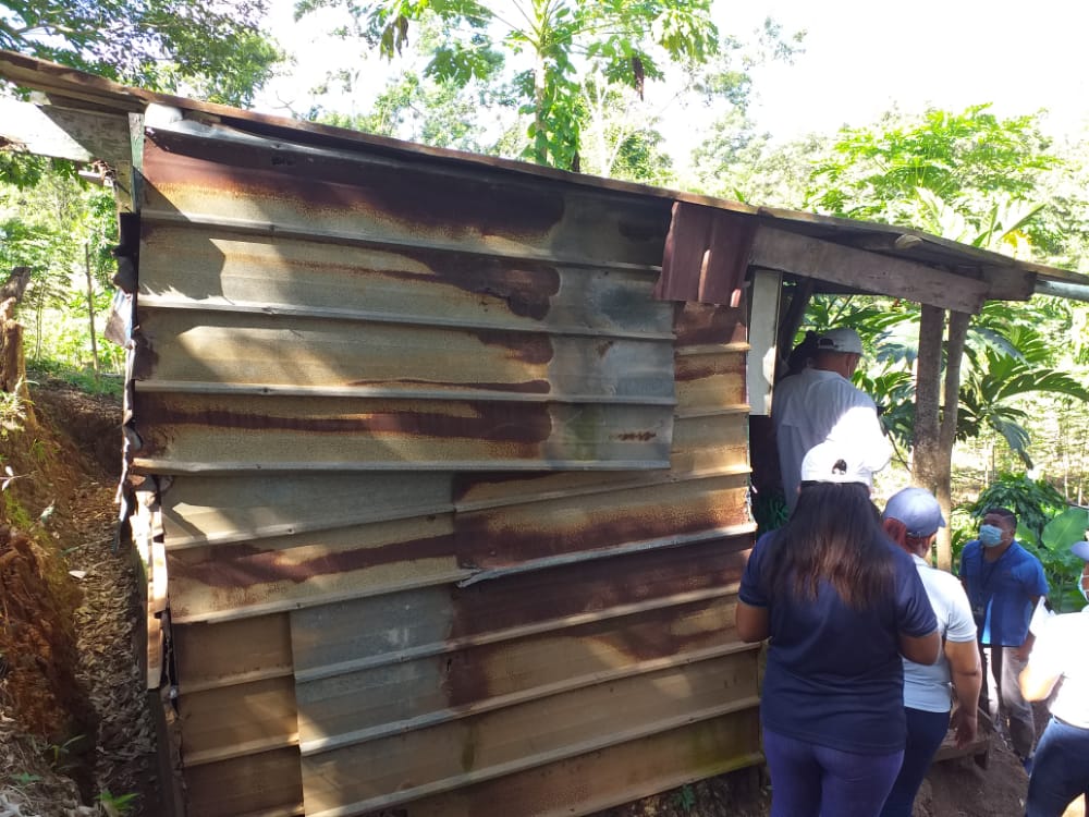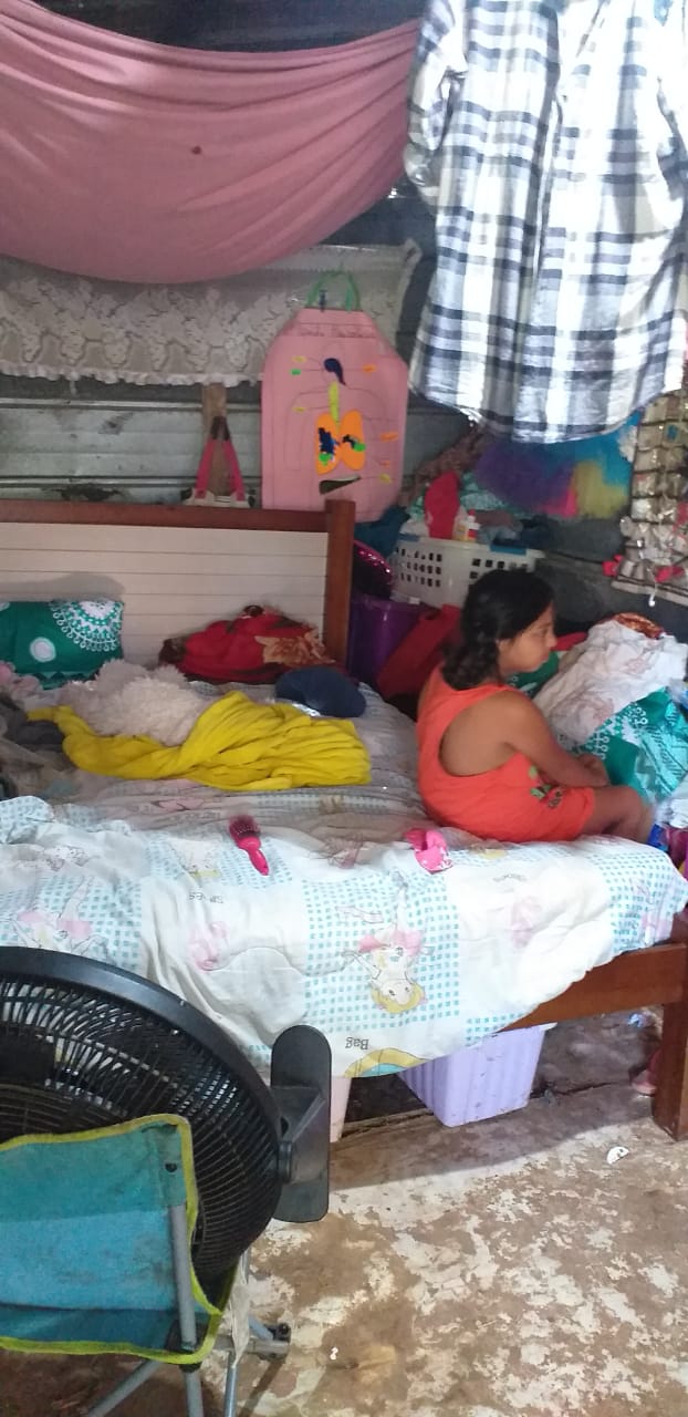 Esta familia monoparental habita en una vivienda construida con material improvisado con paredes de cartón y madera, techo de zinc viejo, piso de tierra, sin los servicios básicos y está ubicada en un área de riesgo social, que además fue declarado no habitable en 2015 por el Sinaproc debido a las inundaciones.