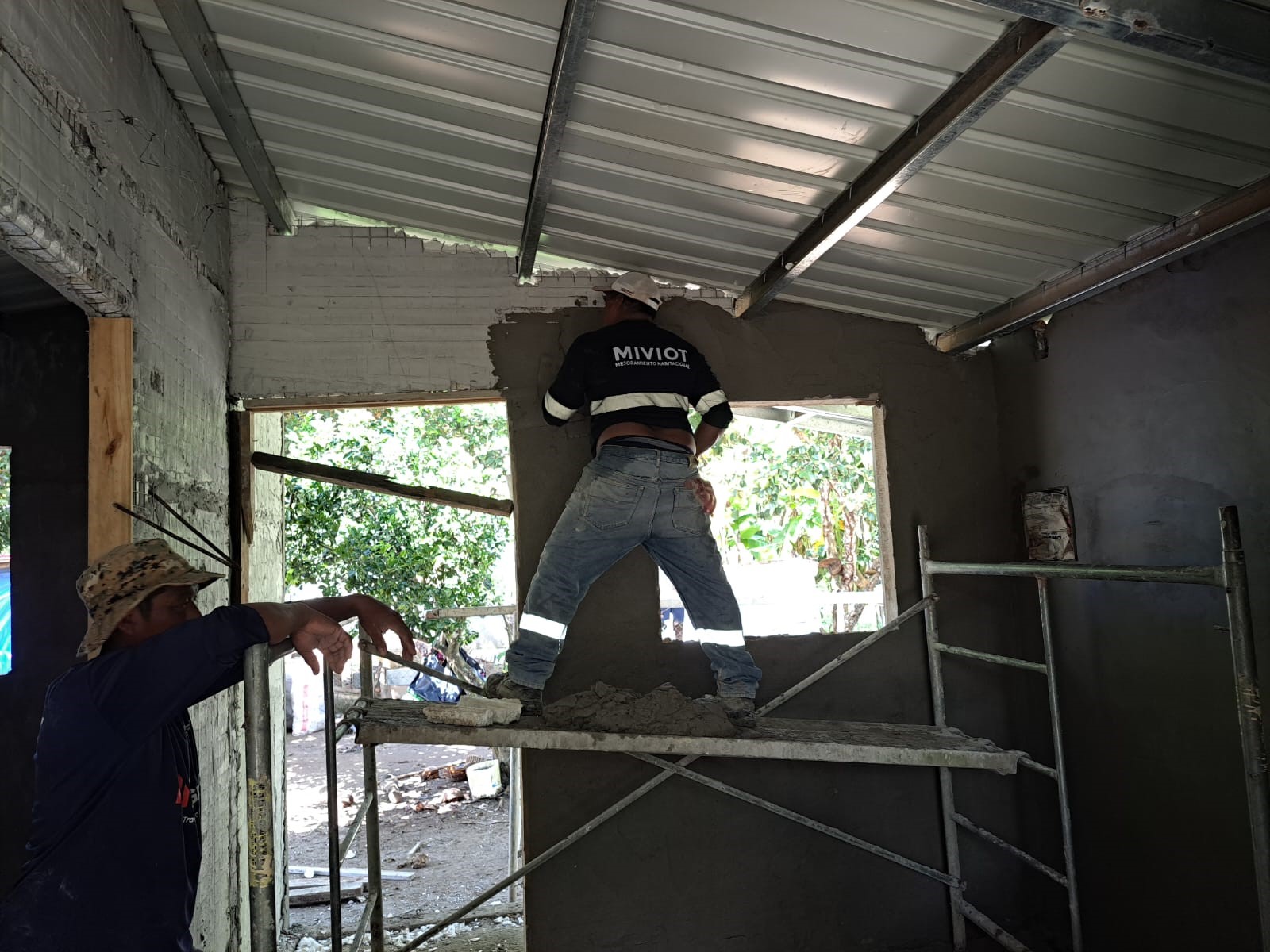 A través del Ministerio de Vivienda y Ordenamiento Territorial (Miviot), el personal avanza en la construcción del nuevo hogar para Enibeth Castillo, de 32 años; su cónyuge Pacífico Arrocha, de 34 años, y sus tres hijas de 14, 9 y 7 años, quienes residen en la comunidad de Hierbabuena, corregimiento de Coclé, en un cuarto levantado de bloque sin repellar, junto a otro cuarto de paredes de lona y zinc, con piso de tierra y techo de zinc.