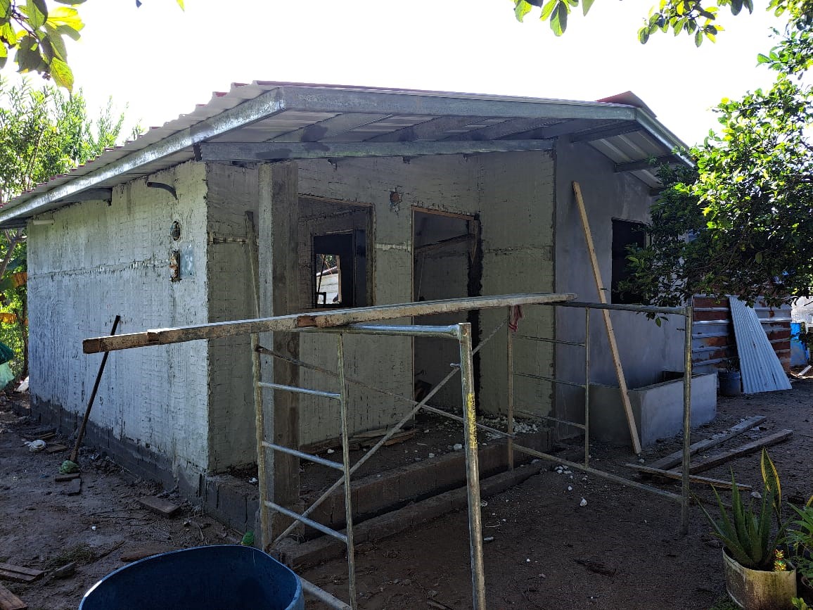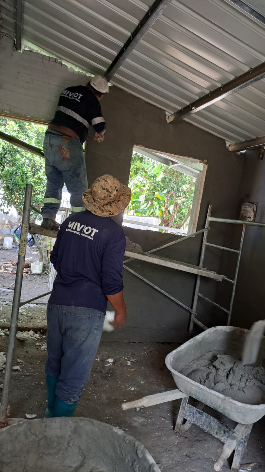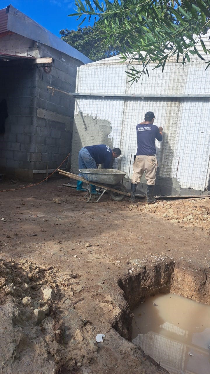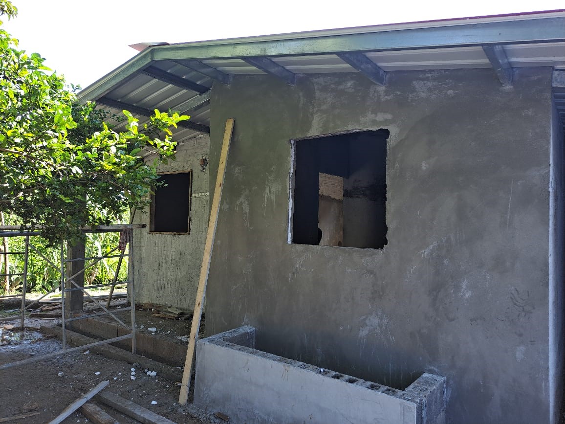 Los trabajadores han avanzado en el levantamiento de las paredes de la casa y colocación total del techo, así como el repello de paredes externas e internas.