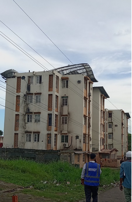 Los edificios 44, 45, 22 y 28 resultaron afectados por desprendimiento de techos debido a los fuertes vientos y lluvias registradas a inicios de agosto. Ocho familias sufrieron daños directos, por lo que el Miviot levantó informes sociales y realizó un balance de la situación, dado que las cubiertas de madera y zinc quedaron severamente comprometidas. Este diagnóstico permitió definir los materiales de construcción requeridos para atender a los residentes de los apartamentos en las plantas superiores.
