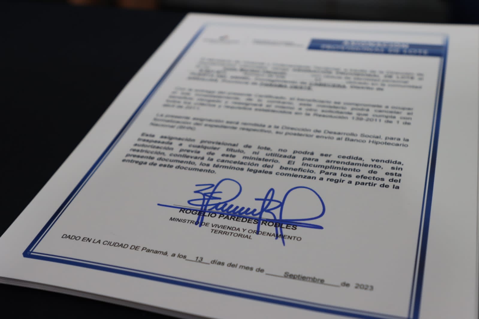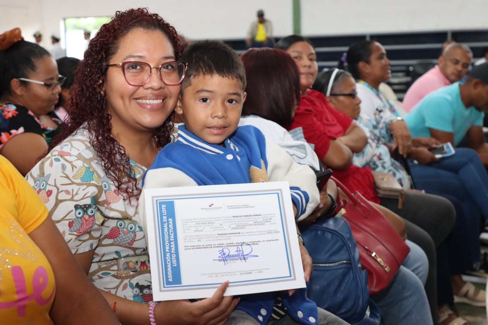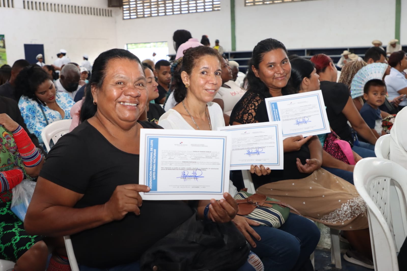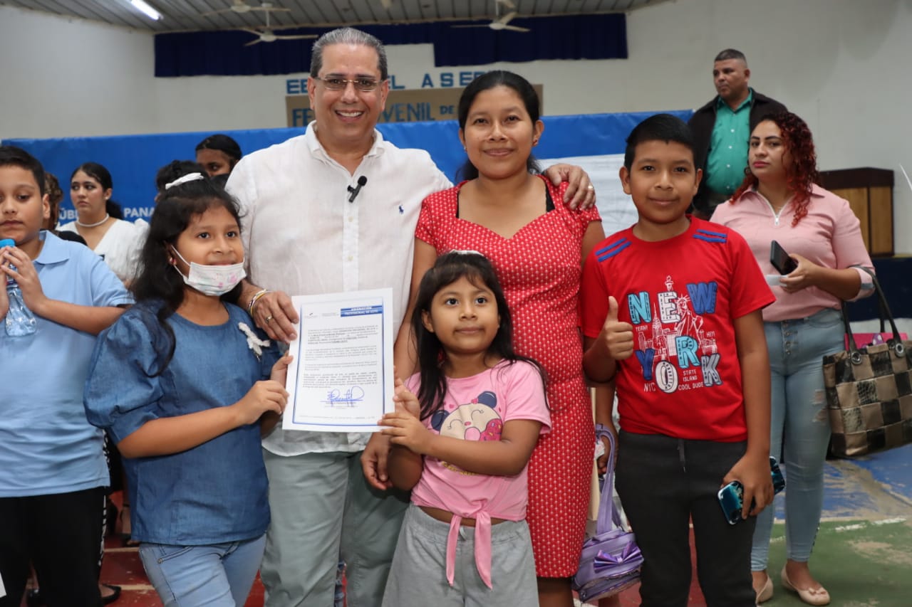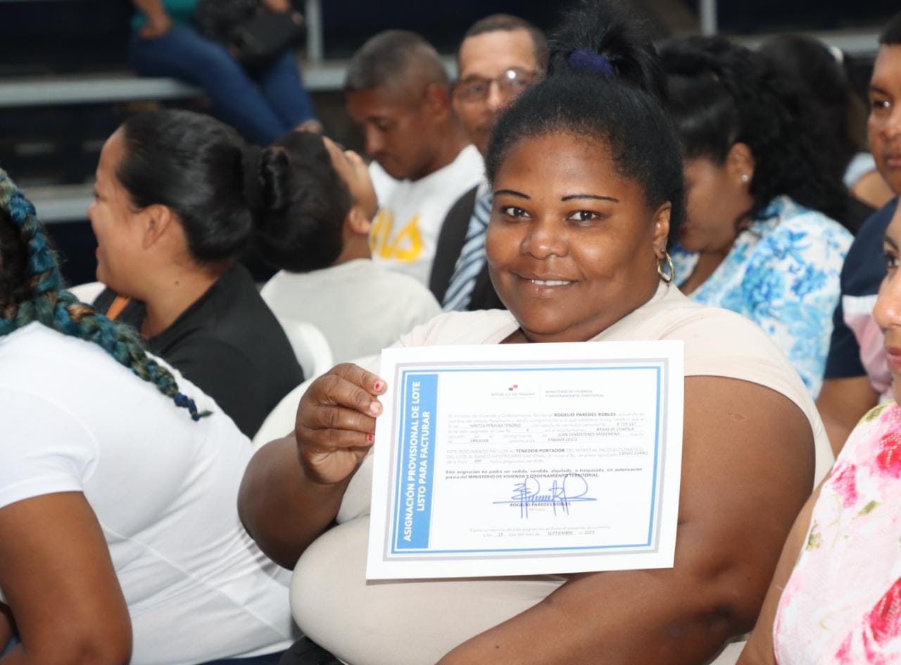 Panamá, 15 de septiembre de 2023. Un total de 213 certificados de lotes a familias humildes entregó el Ministerio de Vivienda y Ordenamiento Territorial (Miviot) en cinco asentamientos informales del distrito de Arraiján, en la provincia de Panamá Oeste, como parte del plan de legalización de tierras que viene desarrollando para brindar seguridad habitacional y una mejor calidad de vida.