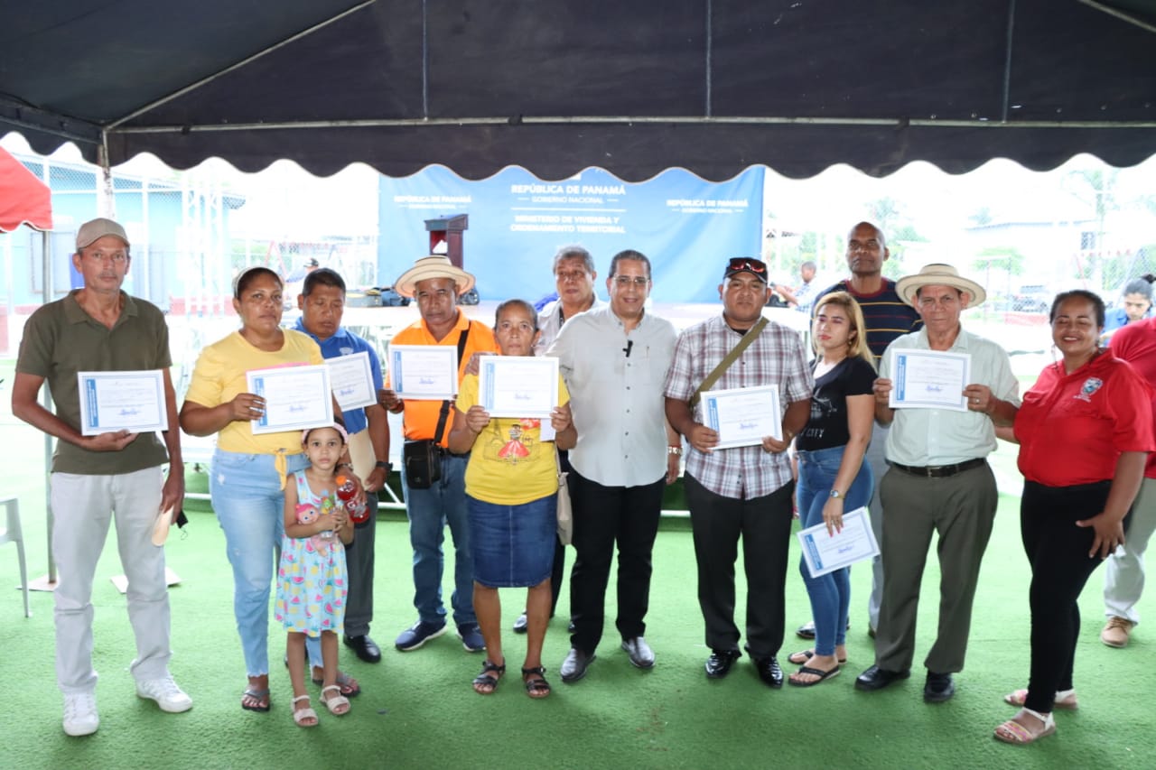 Panamá, 21 de junio de 2023. Un total de 139 certificados de asignaciones de lotes listos para facturar con el Banco Hipotecario Nacional entregó el Ministerio de Vivienda y Ordenamiento Territorial (Miviot) a igual número de familias de cinco comunidades informales, ubicadas en el corregimiento de Las Garzas, al este del distrito de Panamá.