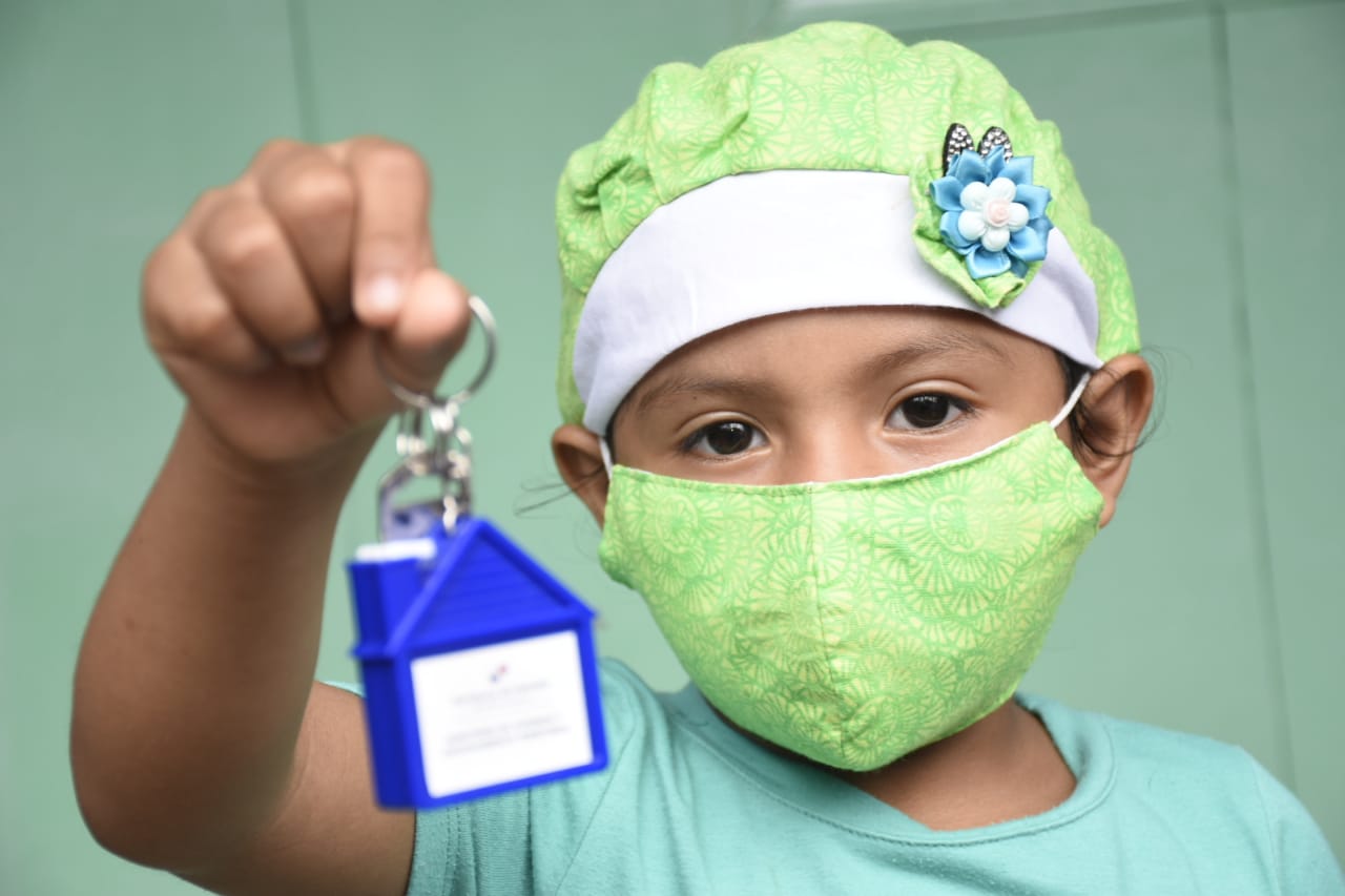 Por su situación vulnerable, se construyó una vivienda de 40.96 metros cuadrados y cuenta con dos habitaciones, baño higiénico, cocina, sala-comedor, lavandería y portal, además el Ministerio de Desarrollo Social (Mides) se encargó de equipar el hogar con dos camas, estufa y comedor.