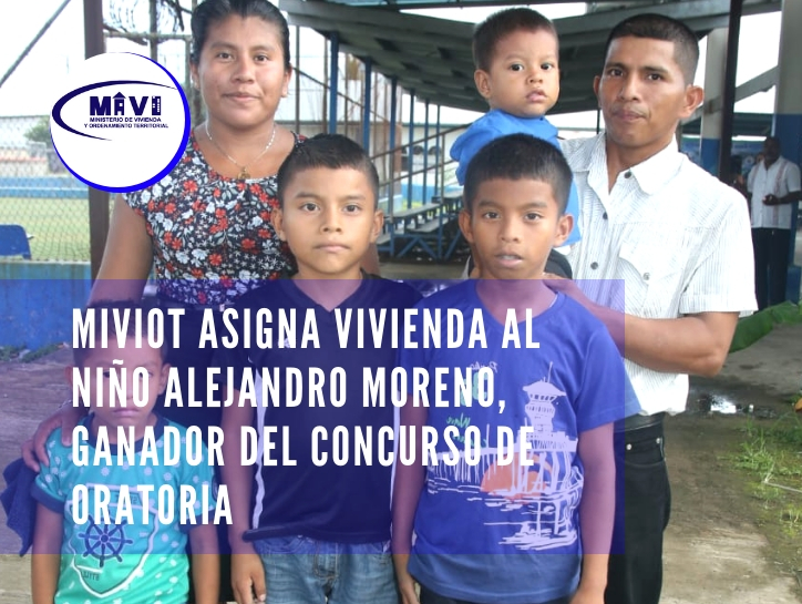 El niño Alejandro Moreno de 11 años, quien se dio a conocer por su gran talento en el concurso nacional de oratoria, recibió una buena noticia por parte del Ministerio de Vivienda y Ordenamiento Territorial (Miviot), y es que, le brindaron una solución habitacional completamente nueva para él y su familia, en el proyecto habitacional Nueva Luz, ubicado en el corregimiento de Chepo Cabecera, Panamá Este.
