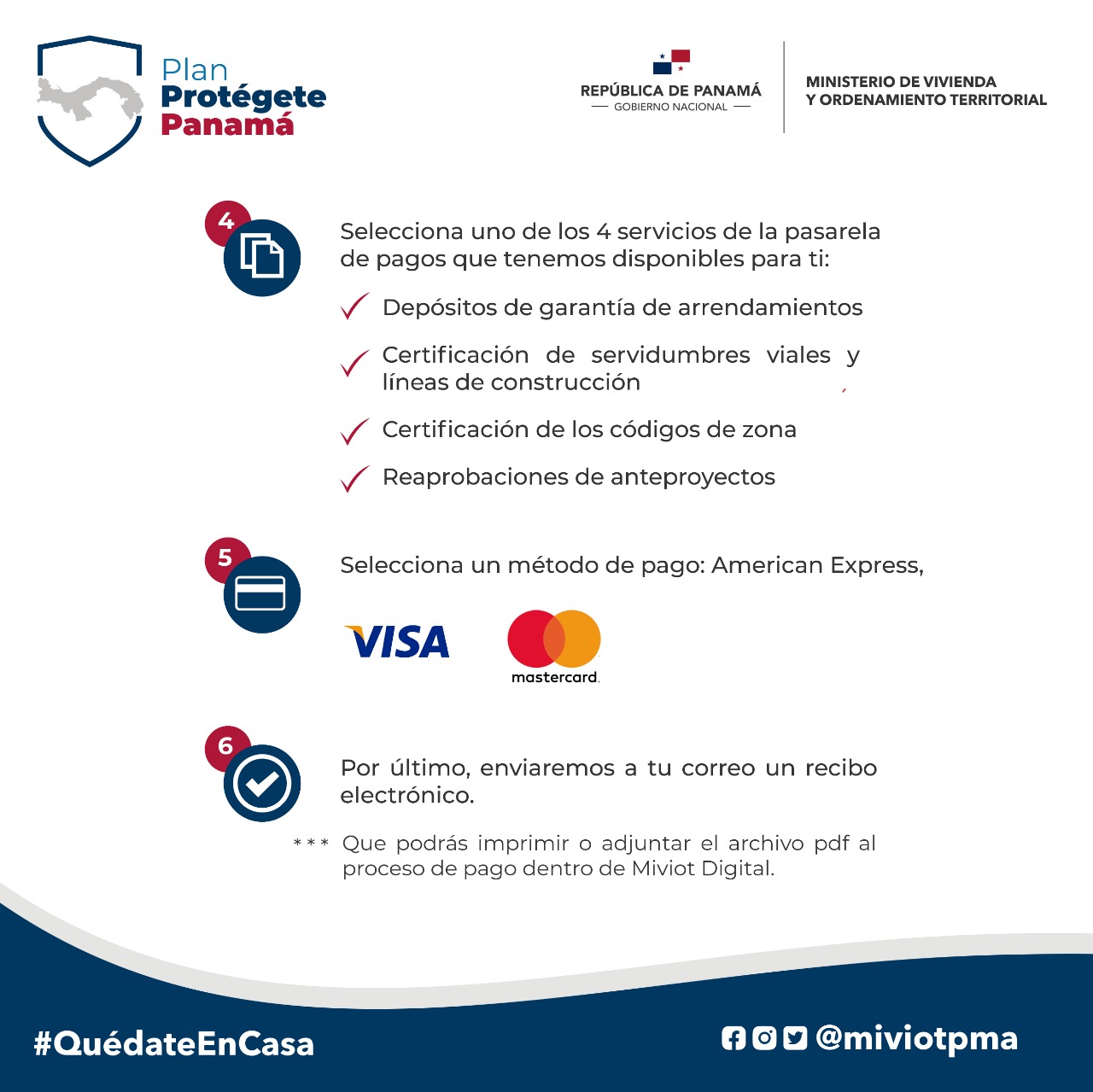 “Es una nueva pasarela de pago que utilizarán todas las instituciones del país; en esta primera etapa solo será por medio de tarjetas de crédito VISA, Mastercard o American Express”, dijo Samudio, quien se mostró confiada que mediante este mecanismo permiten que desde sus casas los usuarios del Miviot continúen con sus proyectos sin tener que arriesgarse y propagar la enfermedad.