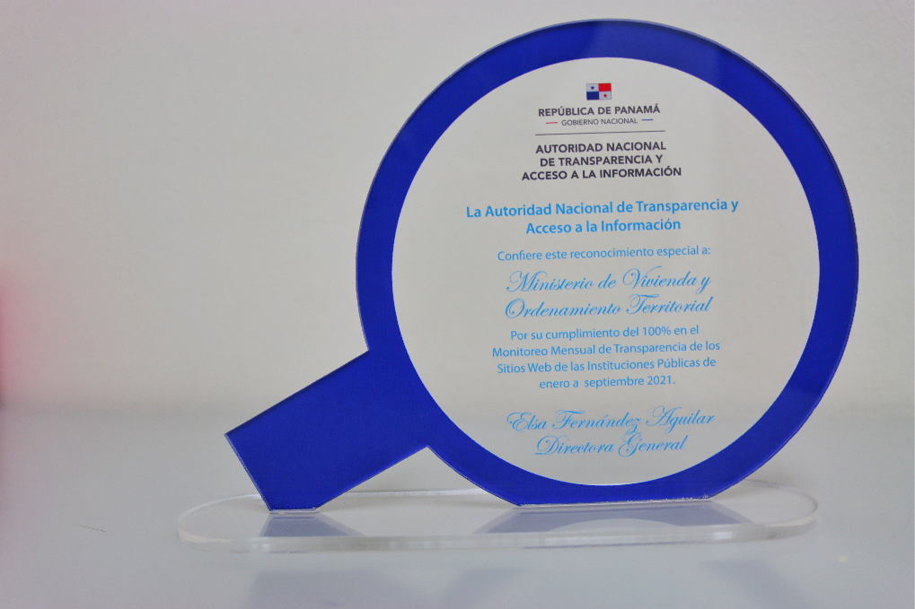 La placa de reconocimiento, que fue recibida por la secretaria general del Miviot, Marta Amado, es en cumplimiento a la Ley No. 6 de 22 de enero 2002 que dicta normas de promoción de la ética, transparencia y acceso a la información en el sector gubernamental.