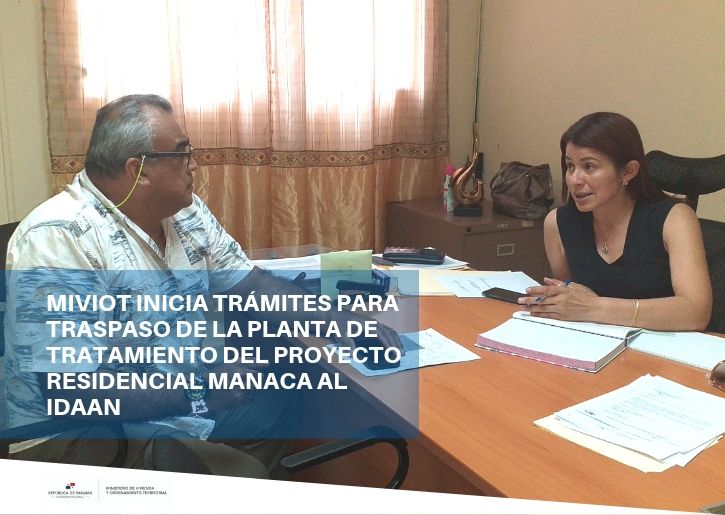 La directora del Ministerio de Vivienda y Ordenamiento Territorial (Miviot) en Chiriquí, Doris Atencio se reunió con el ingeniero Guillermo Ardila, encargado de la sección operativa y sanitaria del Instituto de Acueductos y Alcantarillados Nacionales (Idaan) en la provincia, para coordinar las acciones que permitan traspasar las dos plantas de tratamientos del proyecto Residencial Manaca a manos de esta institución.