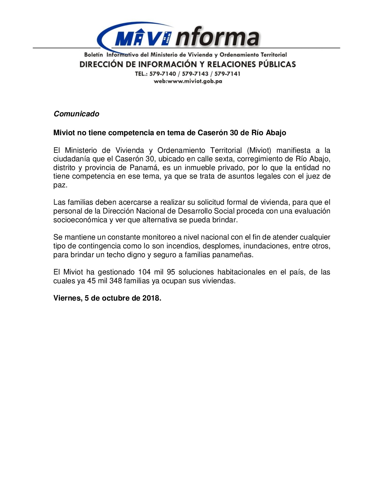 El Ministerio de Vivienda y Ordenamiento Territorial (Miviot) manifiesta a la ciudadanía que el Caserón 30, ubicado en calle sexta, corregimiento de Río Abajo, distrito y provincia de Panamá, es un inmueble privado, por lo que la entidad no tiene competencia en ese tema, ya que se trata de asuntos legales con el juez de paz.