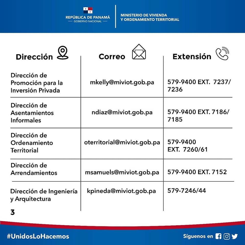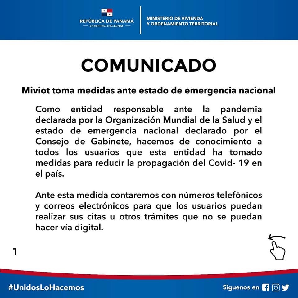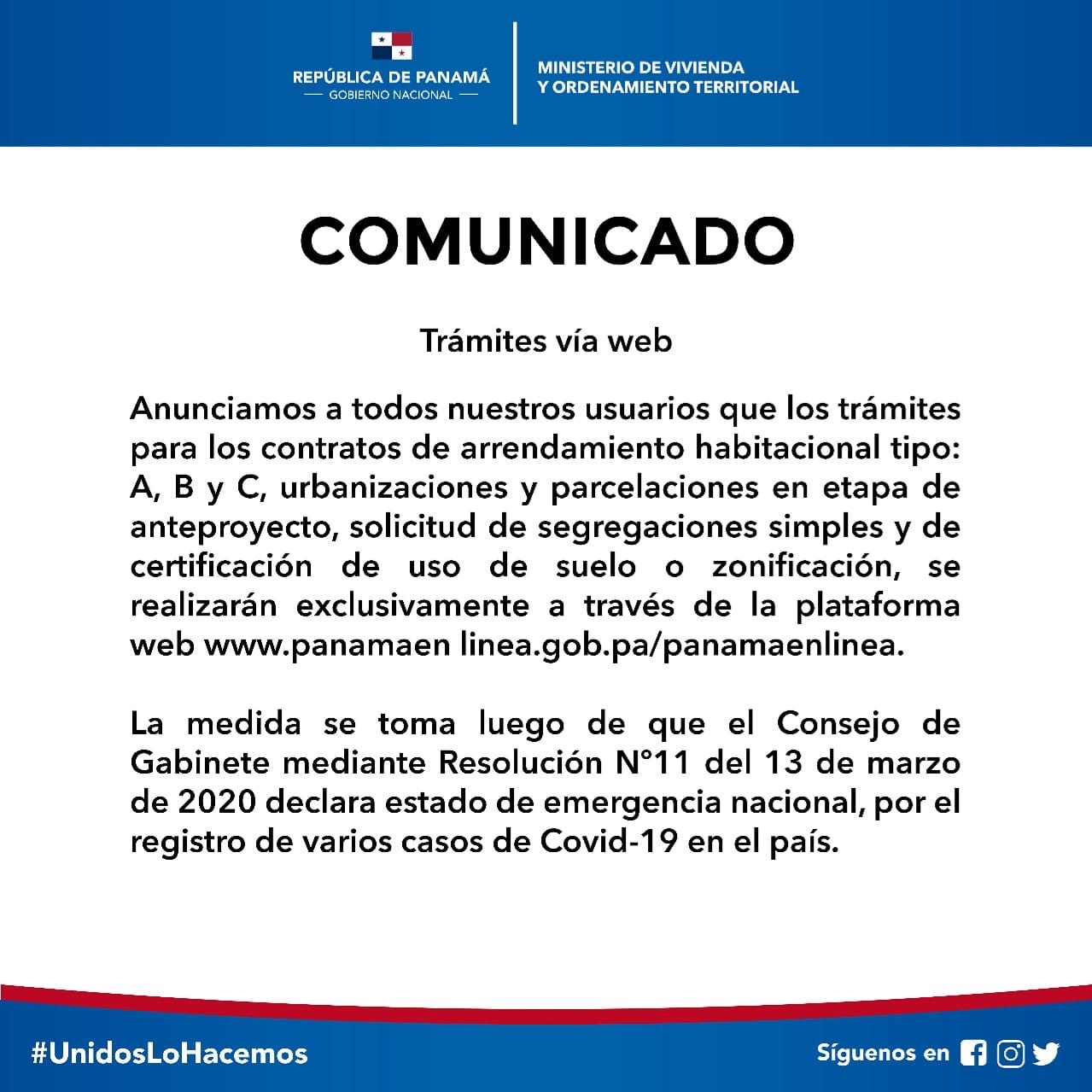 Martes, 17 de marzo de 2020. El Ministerio de Vivienda y Ordenamiento Territorial ha tomado medidas preventivas para el funcionamiento de esta entidad, aplicando la Resolución de Gabinete N° 11 del 13 de marzo de 2020 que declara el Estado de Emergencia Nacional y dicta otras disposiciones.