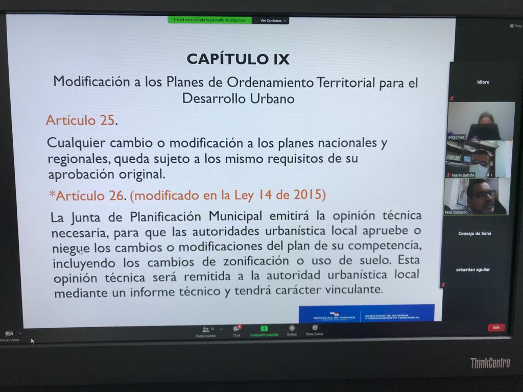 Panamá, 9 de septiembre de 2020. Durante la pandemia por la Covid-19, el Ministerio de Vivienda y Ordenamiento Territorial (Miviot) ha continuado con la labor de orientar y capacitar a los municipios del país en las Juntas de Planificación.
