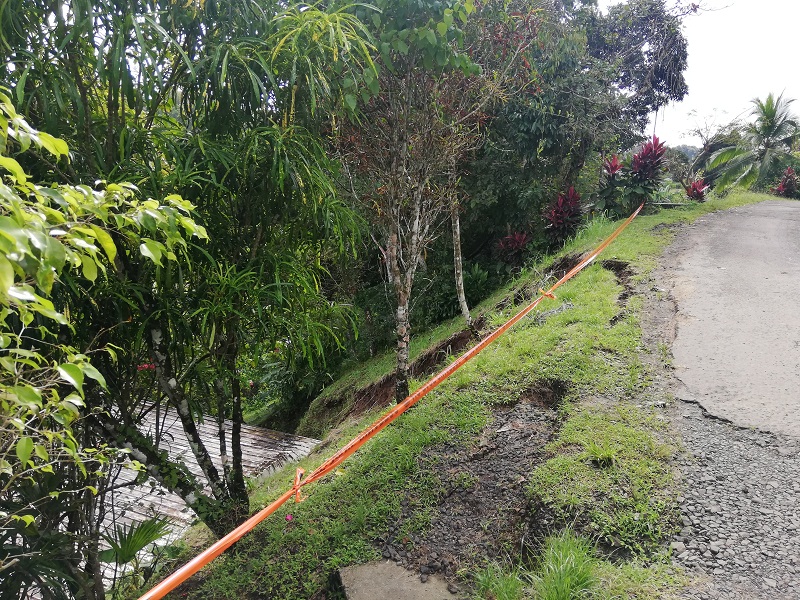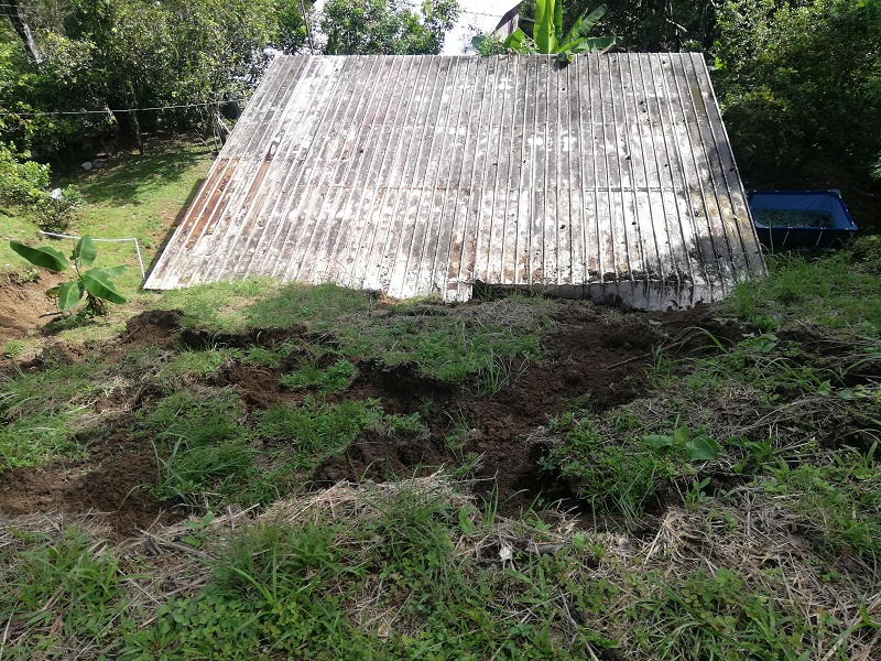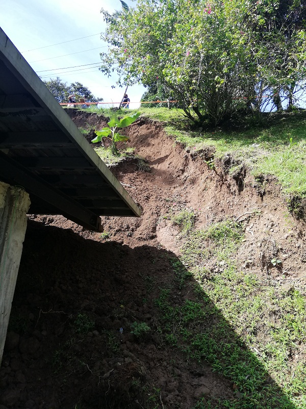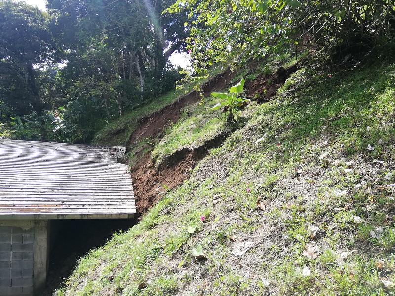 La residencia sufrió daños en el techo y gran cantidad de tierra quedó recostada en la pared lateral, causando humedad en la estructura, lo cual puede producir el debilitamiento de esta parte de la vivienda.