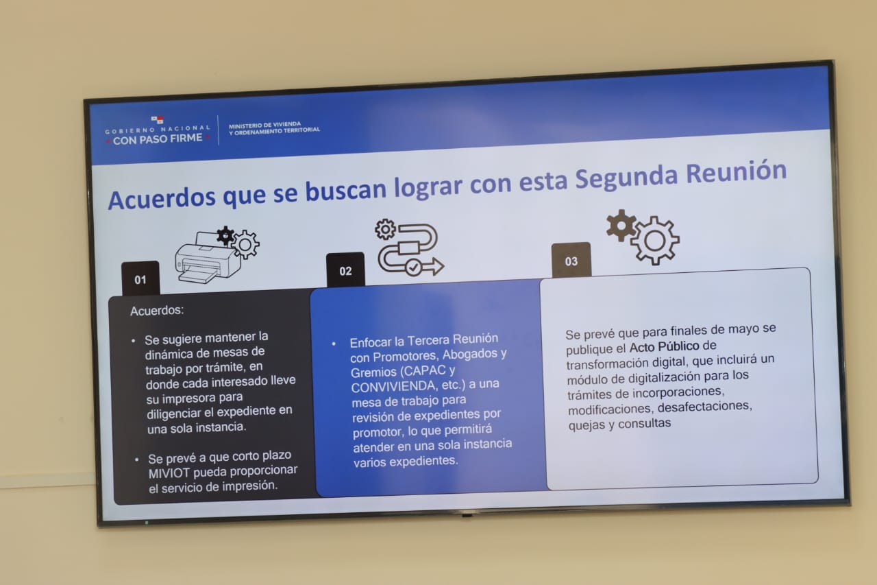 Panamá, 29 de abril de 2025. Una segunda reunión de acercamiento con gremios de la construcción e inmobiliarios realizó el Ministerio de Vivienda y Ordenamiento Territorial (Miviot), para abordar la tramitología en las propiedades horizontales (PH) dentro de la institución.
