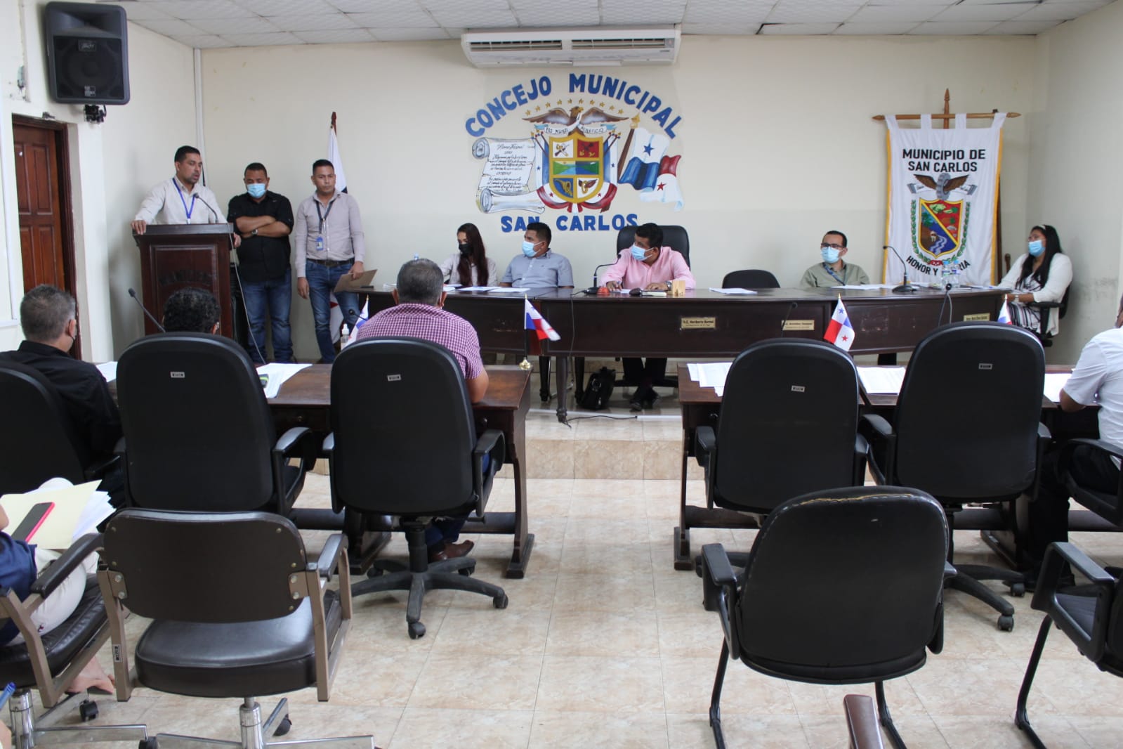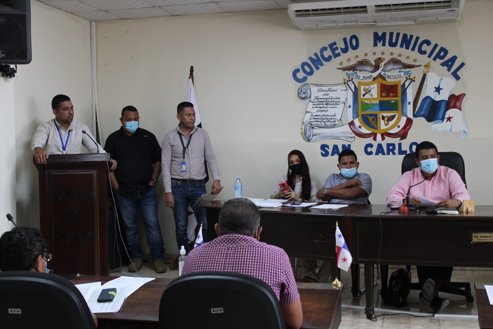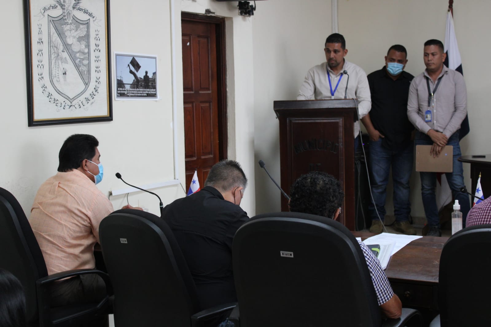 Bill Espinosa, director regional, junto a su equipo de trabajo, durante la sesión del Consejo Municipal del distrito de San Carlos, sustentó un informe del contrato 73-16, adjudicado a la empresa Consorcio Rodarci, S.A. encargada de las construcciones de las casas.