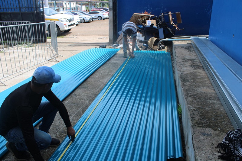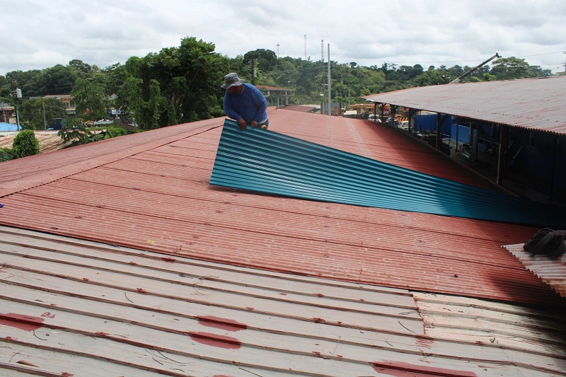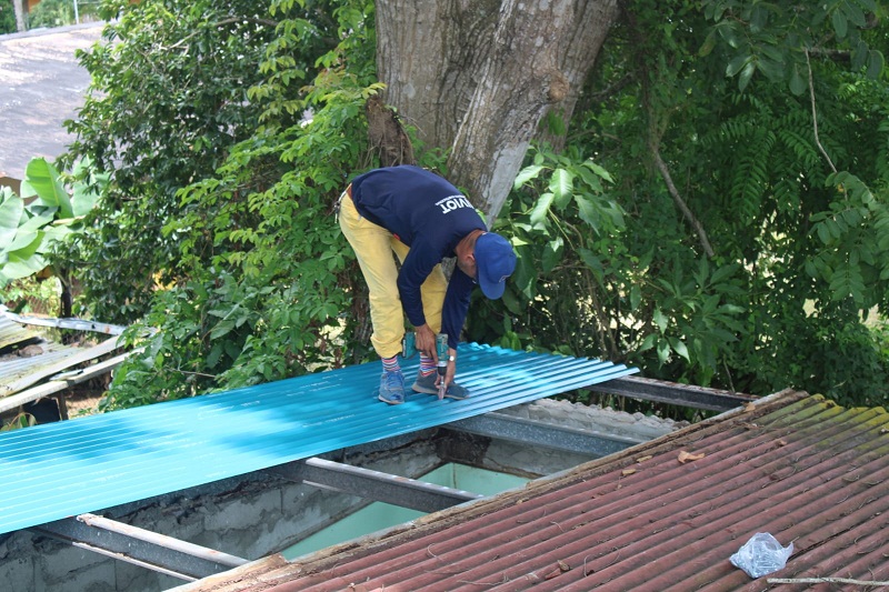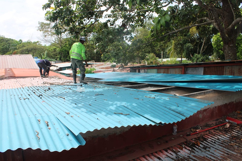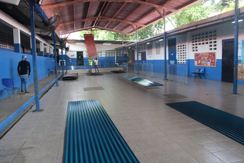 Panamá, 5 de agosto de 2022. Cuadrillas del Ministerio de Vivienda y Ordenamiento Territorial (Miviot) de la provincia Panamá Oeste, en conjunto con personal de la Junta Comunal de Juan Demóstenes Arosemena, en el distrito de Arraiján, realizan reparaciones en el techo del Centro Educativo Básico General (CEBG) Nuevo Arraiján, como parte del apoyo que se le continúa brindado al programa CON Escuela.