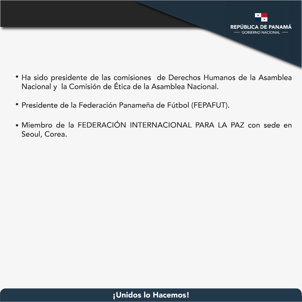 El nuevo ministro entre sus cargos fue viceministro y ministro de Vivienda en el período 1994-1998, presidente del Fondo de Ahorro Habitacional 1994-1999, presidente del Consejo Nacional de Vivienda 1994-1999, diputado electo a la Asamblea Nacional 2004-2009 por el circuito 8-1 Arraiján y luego del 2009 al 2014, miembro de la Federación Internacional para la Paz con sede en Seúl, Corea, entre otros.
