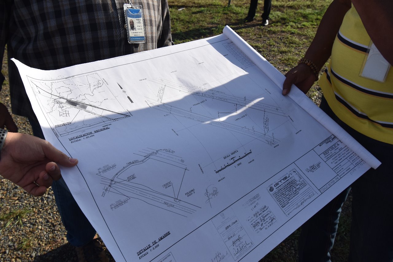 La viceministra de Vivienda, Daniela Martínez López, junto a un equipo de la Dirección de Asentamientos Informales y al subsecretario ejecutivo de la UABR, Esteban Ripoll, recorrió varios puntos en la comunidad de Guna Nega, algunas colindantes con el Corredor Norte, verificando con el mapa los límites.